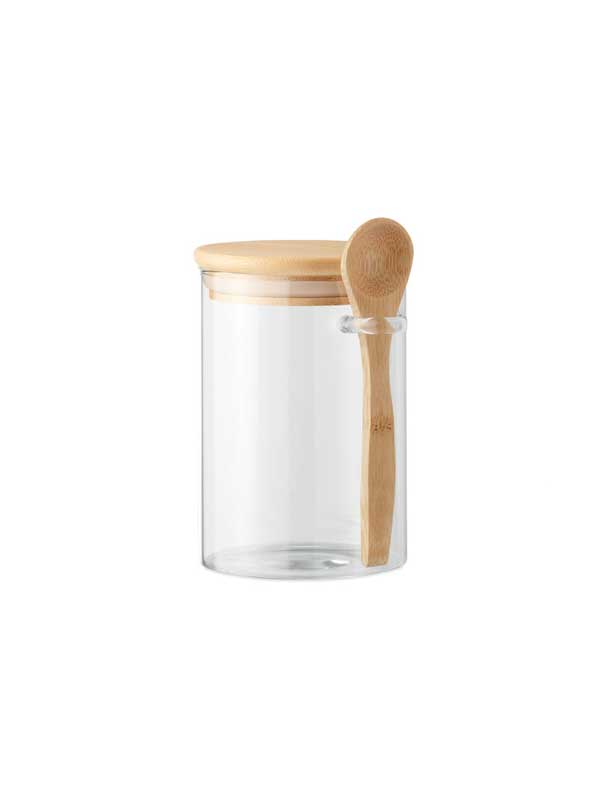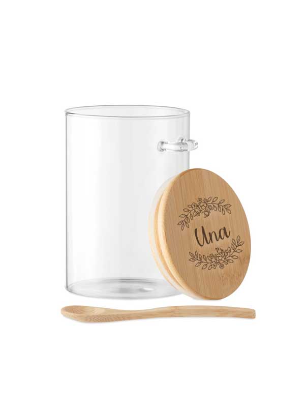 Svaka posuda dolazi s poklopcem i žlicom od bambusa, ekološki prihvatljivog materijala koji dodaje prirodnu notu eleganciji. Dodatna vrijednost dolazi u obliku mogućnosti personalizacije. Imate opciju odabrati između graviranja vašeg imena na poklopcu ili naziva namirnice unutar staklenke, čineći svaku posudu jedinstvenom i posebnom.